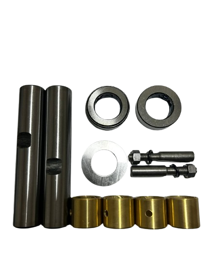 Kit completo para eixo dianteiro, compatível com Ford Cargo 814/815/816/1119, VW Delivery 8-120/8-150/8-160, Agrale e Volare. Contém buchas de bronze, rolamentos, pinos, calços e travas, pronto para instalação nos dois lados do eixo. Alta durabilidade e desempenho para suspensão em uso severo.